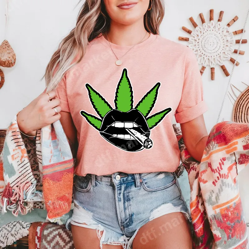 See allUnleash your edgy side with our unique Cannabis Leaf Lips Joint DTF transfer. This vibrant design features bold green marijuana leaves framing striking black lips holding a lit joint, creating a statement piece that's both rebellious and stylish. It’s a perfect ready to press transfer for those who appreciate counter-culture aesthetics and adult-themed humor, designed to stand out on any garment. This heat press design is ideal for cannabis enthusiasts, streetwear aficionados, or anyone looking to add a touch of confident, sassy attitude to their wardrobe. Perfect for 4/20 celebrations, music festivals, casual outings, or as a fun, unconventional gift for friends who appreciate unique apparel. It’s a conversation starter that effortlessly blends pop culture with a bold lifestyle statement, making it a versatile iron on for various personal projects. Our premium DTF transfers are designed for effortless application on a wide range of materials, including cotton, polyester, and various blends. Achieve professional results using a heat press at 300-325°F for 15 seconds with medium pressure. For home users, a household iron can also be used following specific instructions. The beauty of these ready to press transfers is that there’s absolutely no weeding required, saving you time and ensuring a flawless finish every time. Experience superior quality with our direct to film transfer. Each design boasts incredibly vibrant colors and exceptional detail, ensuring your apparel makes a lasting impression. Our transfers are crack-resistant, soft to the touch, and engineered for durability, washing after washing. Printed on professional-grade DTF film with a strong adhesive, these shirt designs provide a smooth, flexible finish that integrates seamlessly with your fabric, ensuring a high-end feel.
