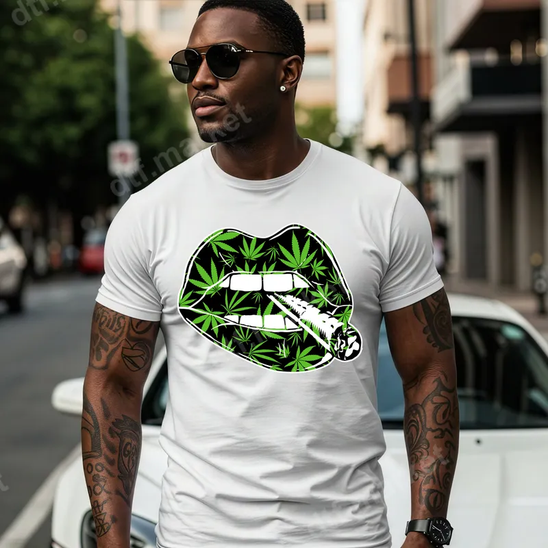 See allUnleash your edgy style with this eye-catching Cannabis Lips and Joint DTF transfer. Featuring vibrant green marijuana leaves filling bold lips, with a lit joint held provocatively between white teeth, this design makes a powerful statement. It's a high-quality, ready to press transfer that brings a unique, counter-culture aesthetic to any garment. This unique design is perfect for cannabis enthusiasts, streetwear aficionados, or anyone looking to add a bold and provocative touch to their wardrobe. Ideal for festivals, concerts, casual wear, or as a distinctive gift for friends who appreciate cannabis culture. It's an excellent way to personalize t-shirts, hoodies, jackets, or bags, making them truly stand out. Our premium DTF transfers are incredibly versatile, adhering seamlessly to cotton, polyester, and various fabric blends. For best results, apply with a heat press at 300-325°F for 15 seconds with medium pressure, then cold peel. You can even use a household iron with firm, even pressure. Unlike vinyl transfers, these iron on decals require no weeding, saving you time and effort for a perfect finish. Experience professional-grade quality with our heat press ready designs. Each direct to film transfer boasts vibrant, crisp colors that resist cracking and peeling, even after multiple washes. The soft-touch feel ensures maximum comfort on any apparel. Crafted from durable DTF film with a strong adhesive, these t-shirt transfers guarantee a long-lasting and impressive customization.