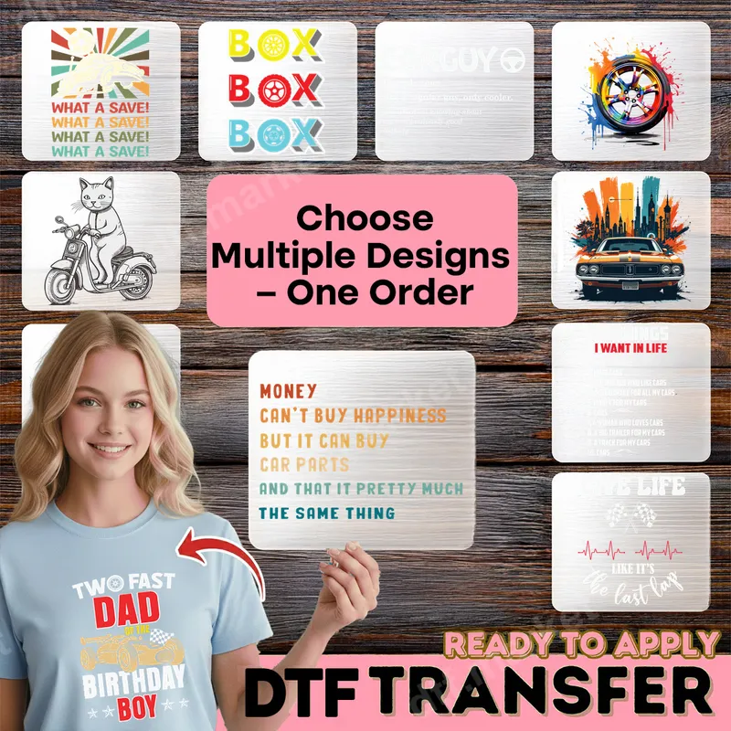 See allDive into our collection of automotive-themed DTF transfers, perfect for every car enthusiast and racing fan. Featuring designs from classic muscle cars and intricate wheel art to funny quotes like "Money can't buy happiness but it can buy car parts," and a special "Two Fast Dad" birthday design, these ready to press transfers embody the thrill of car culture. Each direct to film transfer is crafted to bring high-impact, custom style to any garment. This versatile range of heat press designs is ideal for car aficionados, mechanics, and anyone passionate about speed. They make excellent personalized gifts for birthdays, Father's Day, or anniversaries. Create custom t-shirts for car shows, hoodies for track events, or unique garments for family celebrations. These iron on transfers provide a quick way to express your automotive pride. Applying your new apparel transfer is simple on cotton, polyester, and blends. Use a heat press at 300-325°F for 15 seconds with medium pressure, or a household iron. Unlike vinyl transfer, there's no weeding required. These ready to press transfers are completely prepped for immediate application, saving you time and effort compared to vinyl transfer. Our professional-grade DTF transfer film ensures superior quality. Expect vibrant, crack-resistant colors and a soft-touch finish that lasts wash after wash. Each durable heat press design uses a strong adhesive, bonding securely to your garment for long-lasting, professional results.