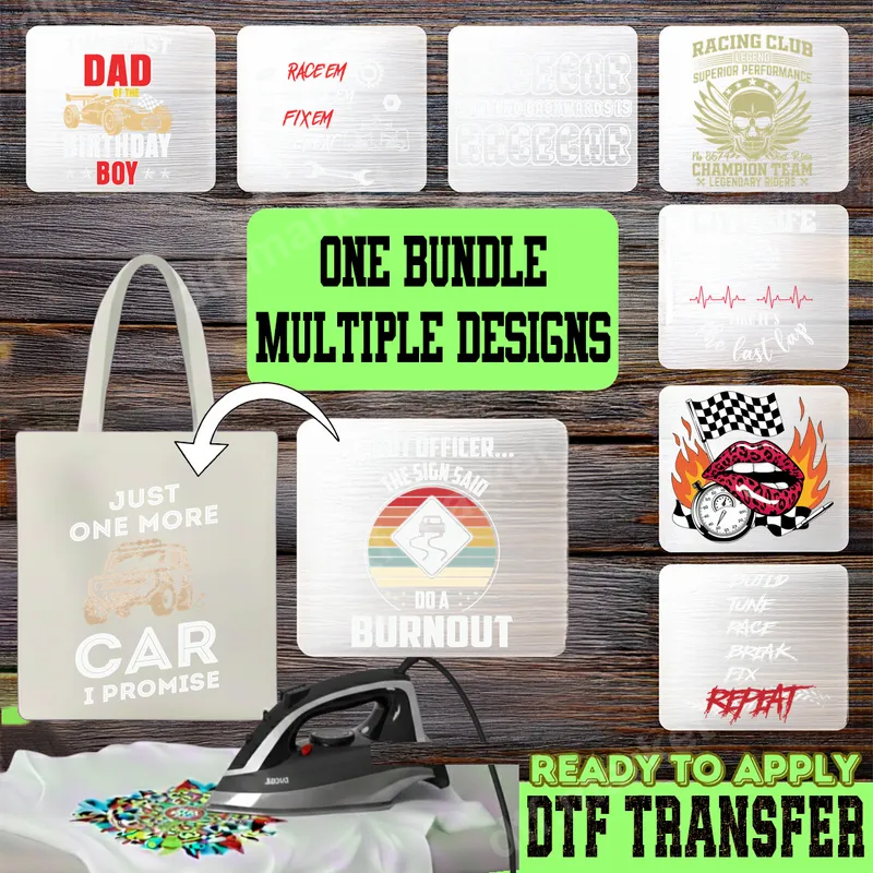 See allThis exciting bundle features 9 dynamic DTF transfer designs tailored for car enthusiasts, racing fans, and mechanics. From humorous phrases like "Just One More Car I Promise" to bold "Racing Club" statements, each design captures the automotive spirit. Graphics range from race cars and off-road vehicles to gears, wrenches, and checkered flags. This versatile collection of direct to film transfers is ready to press, providing a professional finish for your apparel projects. These heat transfer designs are perfect for dads, sons, gearheads, and anyone who loves cars. Ideal for customizing birthday or Father's Day gifts, or creating unique team apparel for car meets, racing events, and automotive clubs. Whether you're a drag racer or enjoy working on engines, these heat press ready transfers offer a fantastic way to express your passion and personalize items. Applying these high-quality iron on transfers is incredibly easy. Our DTF transfers work flawlessly on various fabrics like 100% cotton, polyester, and blends. For best results, use a heat press at 300-325°F for 15 seconds with medium pressure, then cold peel. A household iron can also be used. Forget tedious weeding; these ready to press designs are ready to apply right out of the package. Each apparel transfer in this bundle is crafted using premium DTF technology, ensuring vibrant colors, exceptional durability, and a soft feel. These designs are crack-resistant, wash-resistant, and built to last, maintaining their professional appearance. Our heat press designs use strong adhesive on professional-grade DTF film, guaranteeing a perfect bond to your chosen fabric every time. Elevate your custom clothing game with transfers that truly stand out.