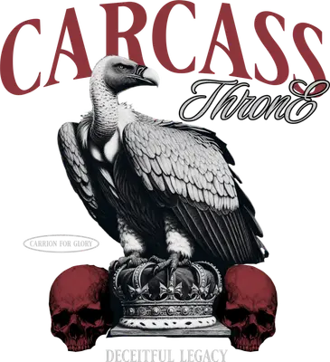 Unleash a dark aesthetic with this striking 'Carcass Throne' DTF transfer. It features a majestic vulture, rendered in intricate detail, perched atop a regal crown, flanked by ominous dark red skulls. The design is framed by the bold 'CARCASS' typography, elegant 'Throne' script, and phrases 'Carrion for Glory' and 'Deceitful Legacy'. This ready to press design perfectly embodies a gothic, metal-inspired vibe, making a powerful statement on any garment. This unique design is ideal for metal enthusiasts, especially fans of the band Carcass, and those who appreciate dark art, gothic fashion, or biker culture. It serves as an exceptional iron on transfer for creating personalized gifts or for adding edgy inventory to small t-shirt businesses and Etsy shops. Showcase this compelling heat transfer design at rock concerts, Halloween events, or as an everyday expression of your distinct style. Applying this heat press transfer is simple and effective across various fabrics like cotton, polyester, blends, and even nylon. For best results, use a heat press at 300-325°F for 15 seconds with medium pressure, or a household iron. Our transfers require no weeding – just peel and press! They are perfect for custom t-shirts, hoodies, tote bags, and denim jackets, offering endless creative possibilities. Experience superior quality with this vibrant ready to press transfer. The full-color printing captures every fine detail, while the soft, smooth texture ensures comfort without the heavy feel of vinyl. Our transfers are crack-resistant and highly durable. Each direct to film transfer is printed on premium DTF film with a strong adhesive backing, guaranteeing professional-grade results that endure countless washes and wears.