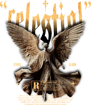 See allStep into the cosmic with this captivating Celestial Angel Wings DTF transfer, featuring a majestic stone angel statue with intricate feathered wings. The distressed 'celestial' typography in a grunge, gothic font sits above, complemented by subtle 'STARS ALIGN' text and a unique 'RESTRICTED R' movie rating label. This design blends spiritual awe with an edgy, alternative aesthetic, making it a truly eye-catching and ready to press statement piece for any garment. This unique iron on transfer is perfect for individuals who embrace gothic fashion, streetwear culture, or love celestial and spiritual art with a rebellious twist. It’s an ideal choice for custom t-shirt businesses looking to offer distinctive designs, crafters wanting a professional-grade heat transfer design, or anyone creating gifts for friends who appreciate alternative styles. Perfect for concerts, festivals, or simply expressing your individuality through your apparel, this versatile design resonates with a younger, fashion-forward audience. Applying this heat press transfer is incredibly simple, making it suitable for both professional and home use. It adheres beautifully to cotton, polyester, cotton-poly blends, and even nylon fabrics. For best results, use a heat press at 300-325°F for 15 seconds with medium pressure, or apply with a household iron. Forget tedious weeding; this custom t-shirt transfer comes ready to press. It’s perfect for customizing t-shirts, hoodies, sweatshirts, denim jackets, tote bags, and even pillow covers. For lasting durability, wash garments inside out and tumble dry low. Experience superior quality with this ready to press transfer. It boasts vibrant, full-color printing with exceptional detail, capturing every nuance of the distressed textures and angel wings. The result is crack-resistant and soft to the touch, without the heavy, stiff feel often associated with vinyl transfers. Each direct to film transfer is printed on premium DTF film, featuring a strong adhesive backing to ensure professional, long-lasting results every single time.