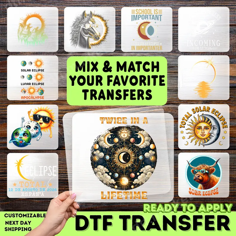 See allCapture the magic of rare celestial events with our exquisite 'Twice in a Lifetime' DTF transfer. This intricate design features a mesmerizing blend of sun, moon, and stars, intertwined with ethereal clouds and a partial eclipse at its heart. The sophisticated artistic style and the poignant phrase make this a unique direct to film transfer, perfectly capturing the wonder of the cosmos. It arrives ready to press, ensuring a smooth and effortless application onto your chosen apparel. This celestial heat press design is ideal for astronomy enthusiasts, stargazers, and anyone who appreciates mystical or spiritual aesthetics. It makes an exceptional gift for birthdays, celebrating significant life events, or commemorating actual solar and lunar eclipses. Imagine customizing a special t-shirt or tote bag to wear to an eclipse viewing party, or simply to express your connection to the universe. This versatile iron on decal speaks to those who find inspiration in the vastness of space. Our premium DTF transfers are designed for effortless application on a wide range of fabrics, including cotton, polyester, and various blends. Achieve professional results using a heat press at 300-325°F for 15 seconds with medium pressure. For personal projects, a household iron can also be used with careful attention. The beauty of these transfers is that they require no weeding, saving you time and effort while producing crisp, vibrant images every time. Experience superior quality with our DTF transfers. Each apparel transfer boasts incredibly vibrant colors that resist cracking and fading, maintaining their stunning appearance wash after wash. The professional-grade DTF film provides a soft, flexible feel on the garment, ensuring comfort and durability. With strong adhesive properties, your new heat press ready design will securely bond to your fabric, offering a long-lasting, high-quality finish.