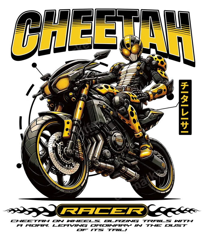 See allThis dynamic "Cheetah Racer" DTF transfer showcases a sleek, futuristic motorcycle rider in a striking yellow and black suit with cheetah spots. The design features a powerful sportbike with intricate mechanical details and bold "CHEETAH" typography. Japanese characters "チーターレーサー" (Cheetah Racer) add an authentic touch. This ready to press design blends speed, style, and sci-fi anime flair, perfect for making a statement on any apparel. Ideal for motorcycle enthusiasts, anime and manga fans, and lovers of high-octane racing aesthetics, this design is fantastic for personalizing your wardrobe. It's perfect for casual wear, conventions, bike rallies, or as a unique gift. Elevate your gear with this powerful heat press transfer, capturing the thrill of the ride and a distinctive streetwear fashion. Applying this vibrant iron on transfer is straightforward for both professional heat presses and household irons. Our DTF transfers adhere beautifully to cotton, polyester, and various blends. For best results, use a heat press at 300-325°F for 15 seconds with medium pressure, then cold peel. Enjoy hassle-free application with no weeding required, making custom apparel creation simple. Experience superior quality with every apparel transfer from dtf.market. Our professional DTF film ensures your design is vibrant, crack-resistant, and boasts a soft, lightweight feel. The strong adhesive guarantees long-lasting durability, making this t-shirt transfer a reliable choice. Transform ordinary clothing into extraordinary statements with a high-quality direct to film transfer.