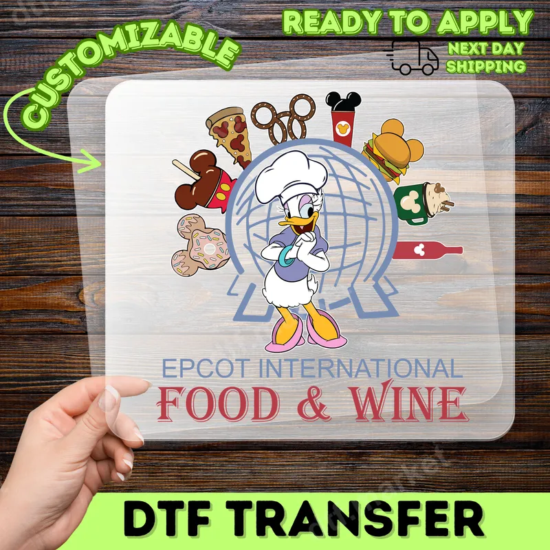 See allImmerse yourself in the culinary magic of Epcot with this delightful Chef Daisy Duck DTF transfer. This vibrant, ready to press design showcases Daisy Duck proudly wearing a chef's hat, standing in front of the iconic Epcot globe outline. Around her float an array of delectable, Mickey-shaped treats: pizza, a pretzel, a burger, an ice cream bar, a frosted donut, coffee, and a wine bottle. The text "EPCOT INTERNATIONAL FOOD & WINE" clearly sets the festive scene. This unique design is perfect for Epcot enthusiasts, Disney lovers, and anyone who cherishes the gastronomic adventures of the Food & Wine Festival. It’s an ideal way to commemorate a trip, prepare for a visit, or simply express your passion for Disney and delicious food. Whether you're a devoted foodie or searching for a charming gift, this design adds a whimsical touch to any wardrobe or accessory. Our premium direct to film transfer is incredibly versatile, applying flawlessly to a wide range of materials including 100% cotton, 100% polyester, and all fabric blends. Application is a breeze – simply use a heat press at 300-325°F for 15 seconds with medium pressure, or even a household iron for smaller projects. No weeding required, making your customization quick and effortless. This heat press design is truly ready to go. Crafted for durability and exceptional visual appeal, this heat press ready transfer boasts vibrant colors that resist cracking and fading, ensuring your design looks fresh wash after wash. The finished product is soft to the touch, seamlessly integrating with your garment for maximum comfort. Each apparel transfer uses professional-grade DTF film and strong adhesive, guaranteeing a long-lasting, high-quality application that will turn heads.