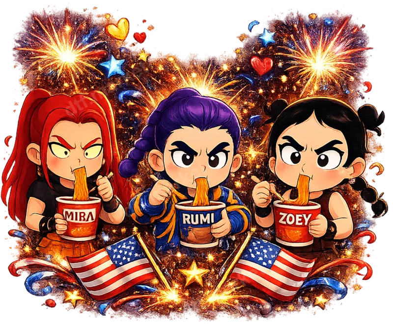 Chibi Anime Girls Noodle Eating Fireworks USA DTF Transfer