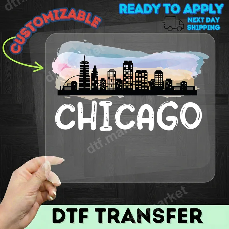 See allThis vibrant DTF transfer showcases the iconic Chicago skyline silhouette against a soft, artistic watercolor background. Below the cityscape, "CHICAGO" is boldly displayed in a clean, modern font, capturing the essence of the Windy City. This ready to press design offers urban sophistication with artistic flair, perfect for expressing local pride or commemorating a memorable visit. This unique heat transfer is ideal for Chicago natives, proud residents, avid travelers, or anyone who loves the city's vibrant energy. It makes a fantastic personalized gift for birthdays, anniversaries, or as a thoughtful souvenir. Perfect for sporting events, music festivals, or everyday wear, this design lets you showcase your connection to Chicago. It's also great for small businesses creating custom Chicago-themed apparel. Applying this heat press design is simple for both beginners and experienced crafters. It works beautifully on a wide variety of fabrics, including 100% cotton, 100% polyester, and popular cotton/poly blends. For best results, use a heat press at 300-325°F for 15 seconds with medium pressure, then peel cold. A household iron can also be used. Enjoy professional-looking results with no weeding required. Experience superior quality with this durable iron on transfer. Our DTF transfers boast vibrant colors, exceptional detail, and a soft, smooth finish. Engineered to be crack-resistant and withstand numerous washes, this apparel transfer ensures your design remains stunning. Printed on professional-grade DTF film with strong, flexible adhesive, you can trust in a long-lasting, high-quality application.