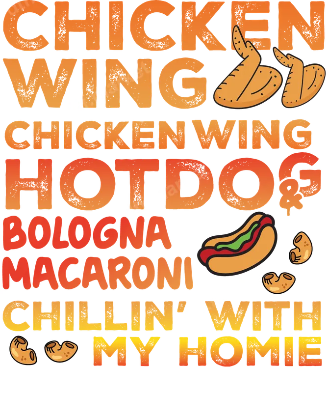 See allInject laid-back humor into your wardrobe with this 'Chicken Wing, Hot Dog & Bologna Macaroni Chillin' With My Homie' DTF transfer. Featuring bold, distressed gradient text in warm orange and yellow, accompanied by playful illustrations of chicken wings, a hot dog, and macaroni noodles, this design captures casual comfort and friendship. This vibrant, detailed DTF transfer is completely ready to press onto your favorite garments, making customization a breeze. Perfect for foodies, best friends, or anyone who loves a good laugh and classic comfort food, this design is ideal for casual hangouts, backyard BBQs, game nights, or just lounging with your crew. It makes an excellent unique gift for a buddy's birthday or simply to celebrate good company and great snacks. Show off your relaxed vibe and love for delicious treats with this fun and relatable graphic. Applying this graphic is simple, whether you're a seasoned pro or new to custom apparel. This versatile heat transfer works beautifully on cotton, polyester, and blends. For best results, apply with a heat press at 300-325°F for 15 seconds with medium pressure, then cold peel. A household iron on its highest setting can also be used. No tedious weeding is required, making this an effortless iron on decal for any project. Experience the superior quality of our professional direct to film transfer technology. Our transfers boast vibrant colors, crisp details, and exceptional durability, resisting cracking and fading wash after wash. The soft-touch finish ensures maximum comfort, making your custom shirt design feel like part of the fabric. Each heat press ready transfer uses premium DTF film and strong adhesive, guaranteeing a long-lasting, professional finish on all your apparel.