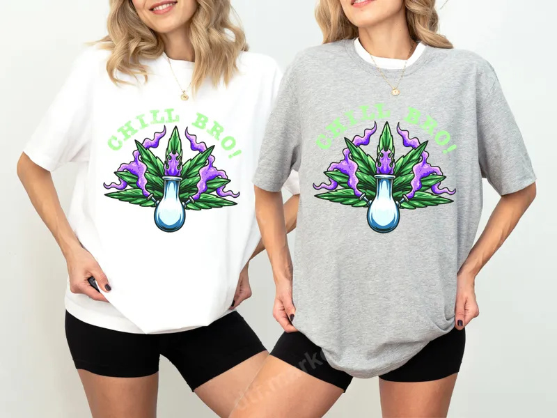 See allThis eye-catching DTF transfer features the bold, distressed neon green text "CHILL BRO!" arched above a vibrant illustration. At its core is a sleek, clear glass bong, artfully framed by lush green cannabis leaves. Purple smoke or tendrils emerge from the design, adding a mystic and edgy vibe to this unique graphic. This ready to press design is perfect for those who want to express a relaxed, carefree attitude. Ideal for cannabis enthusiasts, streetwear aficionados, and anyone who appreciates adult humor, this design makes a fantastic statement piece. It's perfect for casual outings, parties, music festivals, or simply lounging at home. This distinctive heat press transfer also makes a great gag gift or a fun present for friends who appreciate a laid-back, 420-friendly aesthetic. Applying this apparel transfer is straightforward. It works seamlessly on a wide variety of fabrics, including cotton, polyester, and their blends. For best results, use a heat press at 300-325°F for 15 seconds with medium pressure. Alternatively, a household iron can be used with care. There's no tedious weeding required, making this an easy iron on decal for quick customization. Crafted using premium DTF film, this direct to film transfer boasts incredibly vibrant colors and a soft, smooth feel once applied. It’s designed to be durable, crack-resistant, and washable, ensuring your custom creation maintains its professional look. Elevate your wardrobe with a high-quality heat press design that stands out.