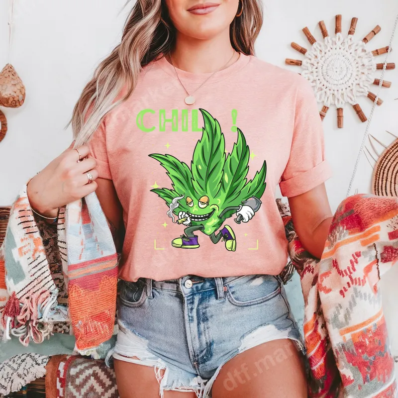 See allDive into relaxed vibes with this playful "Chill!" DTF transfer featuring a cool cannabis leaf character. This fun, ready to press design showcases a happy, smoking marijuana leaf holding a microphone, ready to spread good times. The vibrant colors and dynamic style make it a perfect statement piece for anyone who appreciates a laid-back attitude and a touch of humor in their apparel. It's an instant way to add personality to your wardrobe. This unique heat press transfer is ideal for individuals who love cannabis culture, funny graphics, or simply want to express a carefree spirit. It makes an excellent gift for friends who appreciate adult humor, celebrate 4/20, or enjoy music festivals and casual gatherings. Perfect for personalizing apparel for parties, weekend lounging, or just adding a smile to your everyday wear. Applying this durable heat transfer is simple with either a heat press or a household iron. For best results, use a heat press at 300-325°F for 15 seconds with medium pressure. It works flawlessly on a wide range of materials, including cotton, polyester, and their blends. Forget about tedious weeding; this iron on transfer comes ready to apply directly to your chosen garment, making custom creation effortless. Experience professional-grade quality with every print. Our DTF transfers are renowned for their vibrant colors that truly pop and resist cracking, peeling, or fading wash after wash. The soft-touch feel ensures maximum comfort, integrating seamlessly with the fabric. Crafted using premium DTF film and strong adhesive, this apparel transfer promises a lasting, high-definition finish for all your custom creations.