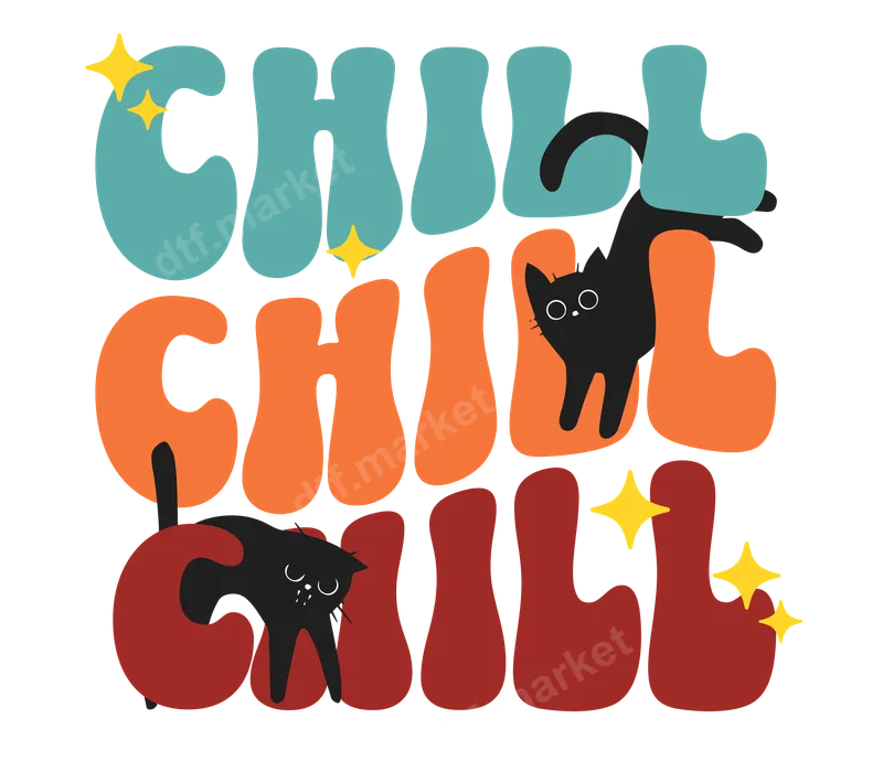 See allEmbrace ultimate relaxation with our 'Chill Chill Chill' DTF transfer, showcasing a groovy retro font in teal, orange, and deep red. Two playful black cats are nestled within the bubbly letters, adding an irresistibly cute touch. This vibrant direct to film transfer captures a laid-back, nostalgic vibe, perfect for relaxed style. It’s a ready to press design that brings instant personality to your apparel. This unique design is ideal for cat enthusiasts, retro fashion lovers, and anyone seeking a fun, stress-free statement. It makes a fantastic gift for friends, family, or yourself on birthdays, casual gatherings, or a lazy weekend. Perfect for customizing your everyday wardrobe, adding personality to loungewear, or creating matching outfits for a cozy cat-themed group. Applying this heat press transfer is incredibly easy, working flawlessly on cotton, polyester, and most fabric blends. For best results, use a heat press at 300-325°F for 15 seconds with medium pressure, then peel cold. A household iron works for smaller projects. Forget weeding vinyl transfers; this iron on decal is perfectly cut and ready to apply, ensuring a smooth, professional finish. Crafted with high-quality DTF film and premium inks, our apparel transfer ensures exceptional vibrancy and durability. The colors are rich, resisting cracking and fading even after multiple washes. This transfer boasts a soft-hand feel, blending seamlessly with fabric without feeling stiff. Enjoy a professional-grade shirt design that stands the test of time and keeps your style fresh.