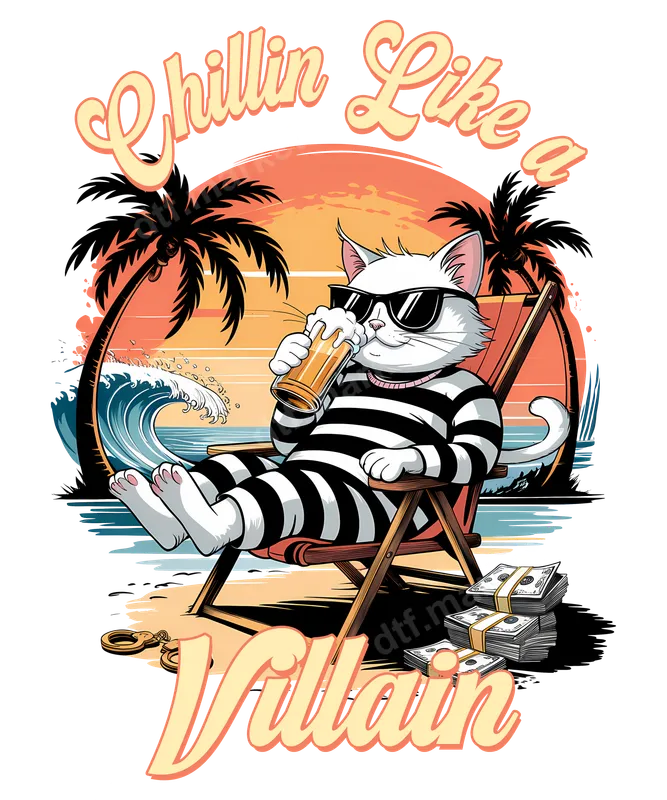See allDive into ultimate relaxation with our 'Chillin Like a Villain' DTF transfer, featuring a cool white cat in prisoner stripes and shades, lounging on a beach chair. Set against a vibrant sunset with palm trees and ocean waves, this design captures an effortlessly edgy vacation vibe. With stacks of cash and a pair of handcuffs nearby, this ready to press transfer hints at a life of leisure after a successful escapade. It's the perfect statement piece for anyone who enjoys a bit of playful mischief. This unique heat press transfer is ideal for cat lovers, anyone with a great sense of humor, or those who embrace a laid-back, "I've earned this" attitude. Perfect for summer vacations, beach outings, casual gatherings, or as a witty gift for friends and family who appreciate ironic fun. It's a fantastic choice for personalizing your wardrobe or creating memorable gifts for birthdays and holidays, adding a touch of humor and style. Applying this vibrant iron on transfer is a breeze, making customization easy for everyone. Our premium heat press ready design works beautifully on a wide variety of materials, including cotton, polyester, and most fabric blends. Simply use a standard heat press at 300-325°F for 15 seconds with medium pressure, or apply with a household iron. Best of all, there's absolutely no weeding required, saving you time and effort for a professional finish. Experience professional-grade quality with this durable t-shirt transfer. Our DTF prints boast incredibly vibrant colors that stand out, excellent crack resistance, and a super soft-to-touch feel on any garment. Printed on high-quality DTF film with a strong, lasting adhesive, this apparel transfer ensures your design remains flawless wash after wash. Transform your everyday items into unique, long-lasting works of art with ease.
