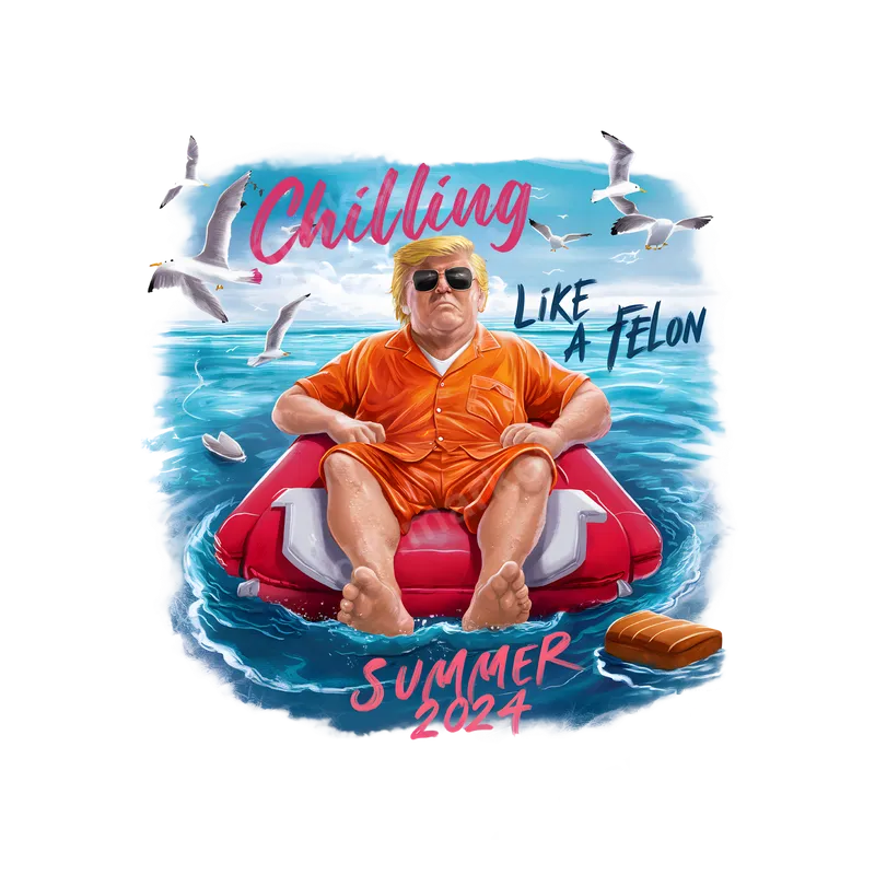See allMake a bold statement this summer with our "Chilling Like a Felon Summer 2024" DTF transfer. This vibrant design features a caricature of Donald Trump in an orange jumpsuit and sunglasses, relaxing on a red inflatable in ocean waves, surrounded by seagulls. The humorous text perfectly captures a sarcastic political vibe. This high-quality direct to film transfer is ready to press, allowing you to instantly customize apparel with a unique, conversation-starting graphic. This edgy design is ideal for anyone with a keen sense of political humor and appreciation for satire. Perfect for summer events, casual gatherings, or political watch parties, this transfer will spark laughter and debate. It makes a fantastic, timely gift for friends or family who enjoy current event commentary and a good chuckle during the 2024 election season. Express your viewpoint with this memorable heat press design. Applying this versatile iron on transfer is simple. Our transfers work on cotton, polyester, and various blends. For best results, use a heat press at 280-300°F (138-149°C) for 6-10 seconds with medium pressure, then perform an instant, hot peel. A household iron can also be used. A major benefit of this heat transfer is no weeding required, streamlining your customization for t-shirts, hoodies, and more. Experience superior quality with this durable apparel transfer. Our DTF technology ensures exceptionally vibrant colors and crisp details. The design is crack-resistant and stretches with the fabric, providing a long-lasting finish and a soft, smooth feel. Crafted with professional-grade DTF film and strong adhesive, this ready to press transfer is designed to withstand countless washes, keeping your political statement fresh and impactful.
