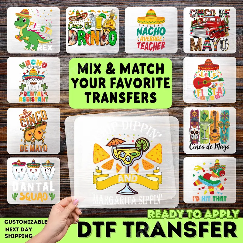 See allDive into relaxation with this vibrant "Chip Dippin' and Margarita Sippin'" DTF transfer. This playful design perfectly captures the essence of a laid-back gathering, featuring a refreshing margarita glass surrounded by delicious tortilla chips. It’s a ready to press design that brings immediate fun to any garment, making it a perfect conversation starter for your next get-together or just a relaxed day out. This fun heat transfer is ideal for anyone who loves good food, great drinks, and a relaxed vibe. Perfect for Cinco de Mayo celebrations, summer backyard barbecues, girls' nights out, or simply unwinding with friends. It also makes a fantastic gift for the margarita aficionado or the host with the most, adding a touch of personalized humor to their wardrobe or accessories. Our premium direct to film transfer can be easily applied to a wide range of materials, including cotton, polyester, and various blends. Achieve professional results using a heat press at 300-325°F for 15 seconds with medium pressure, or apply with a household iron following simple instructions. There’s no complex weeding required, making this an incredibly convenient t-shirt transfer solution. Experience the exceptional quality of our iron on decal. Each DTF transfer is produced with vibrant, long-lasting colors that resist cracking and fading, ensuring your design stays fresh wash after wash. The soft-touch feel of the professional DTF film, coupled with its strong adhesive, guarantees a durable and comfortable finish for all your apparel and accessory projects.