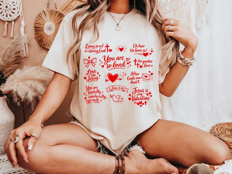 See allThis vibrant red Christian DTF transfer features a beautiful collection of faith-filled quotes and imagery, perfect for expressing devotion. The design includes inspiring messages like "You are so loved," "Living proof of a loving God," and "Jesus is my Valentine," adorned with hearts, crosses, and doves. This high-quality direct to film transfer is ready to press, bringing a heartwarming spiritual touch to any garment. This inspirational iron on transfer is ideal for believers, church groups, youth ministries, and anyone wanting to showcase their Christian faith. It's a thoughtful gift for Valentine's Day, Easter, Mother's Day, baptisms, or just as an everyday declaration of love for God. Create custom t-shirts for worship events, thoughtful presents for friends and family, or unique apparel for personal wear. Applying this heat press transfer is incredibly easy, making it perfect for both beginners and experienced crafters. It works wonderfully on a wide range of materials, including cotton, polyester, and various blends. For best results, use a heat press at 300-325°F for 15 seconds with medium pressure. It can also be applied with a household iron. Best of all, there’s no tedious weeding required – simply press and peel for a flawless shirt design every time. Our professional-grade DTF transfers are known for their exceptional quality. You'll love the vibrant, crisp red colors that truly pop, ensuring your custom transfer stands out. These transfers are designed to be crack-resistant, providing long-lasting durability through countless washes. The soft-to-touch finish ensures maximum comfort, making your finished apparel transfer feel as good as it looks.