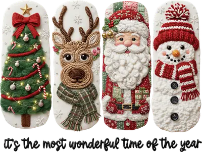 See allThis charming holiday DTF transfer set, "It's the Most Wonderful Time of the Year," is a delightful collection of festive designs, ready to press onto your favorite apparel. Each image, depicting a decorated Christmas tree, a cheerful reindeer in a scarf, a jolly Santa Claus, and a friendly snowman, boasts a cozy, knitted or crocheted texture, giving them a unique, handcrafted appearance. The vibrant colors and intricate details evoke warmth and holiday cheer, perfect for spreading joy. These versatile iron on transfers are perfect for DIY crafters, small business owners creating holiday merchandise, or families looking to make matching Christmas outfits. Ideal for holiday parties, festive gatherings, or as unique gifts, this heat transfer design brings a personalized touch to any garment. Whether you're making shirts for a Christmas cookie decorating event, custom tote bags for gifts, or cozy sweatshirts for winter wear, these designs capture the true spirit of the season. Applying this high-quality heat press transfer is simple and efficient. It adheres beautifully to a wide range of materials including cotton, polyester, and cotton-poly blends, and even nylon. For best results, use a heat press at 300-325°F for 15 seconds with medium pressure, or a household iron. Enjoy the convenience of a ready-to-press design with no weeding required – just peel and press! These designs are perfect for custom t-shirts, hoodies, sweatshirts, tote bags, pillow covers, and even baby onesies or aprons. For lasting durability, wash garments inside out and tumble dry on low. This ready to press transfer features vibrant, full-color printing with exceptional detail, capturing the intricate "knit" textures perfectly. Our DTF transfers are crack-resistant and soft to the touch, ensuring a premium feel without the heavy vinyl stiffness. Each direct to film transfer is printed on premium DTF film with a strong adhesive backing, guaranteeing professional, long-lasting results that will make your creations stand out during the most wonderful time of the year.