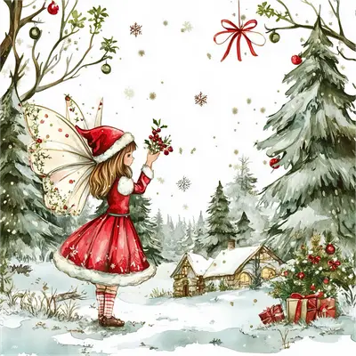 Christmas Fairy Watercolor DTF Transfer | Holiday Elf & Snowy Cabin