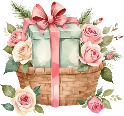 Christmas Gift Basket DTF Transfer with Pink Roses & Evergreen