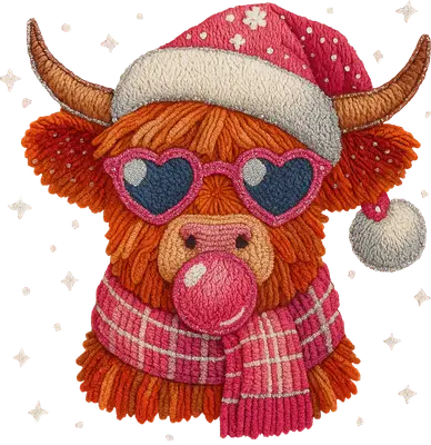 Christmas Highland Cow DTF Transfer with Santa Hat & Heart Glasses