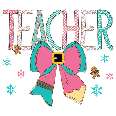 See allThis delightful DTF transfer features the word 'TEACHER' rendered in an array of playful, festive patterns including polka dots, stripes, and whimsical holiday ornaments, all outlined in shimmery gold. Below the vibrant lettering, a charming pink and teal bow, reminiscent of a Santa's belt buckle, adds a whimsical touch. Adorned with cheerful gingerbread men and delicate snowflakes, this design evokes a joyous holiday spirit, making it a perfect ready to press graphic for any educator. Ideal for showing appreciation, this festive heat transfer design is perfect for parents, students, or administrators looking for a unique Christmas gift for their favorite teacher. Small t-shirt businesses and crafters will find this iron on transfer a popular choice for creating custom holiday apparel during the festive season. It's also a wonderful way for teachers themselves to express their holiday cheer in the classroom or at school events. Applying this high-quality heat press transfer is a breeze; it works flawlessly on a wide range of fabrics including cotton, polyester, cotton-poly blends, and even nylon. Simply use a heat press at 300-325°F for 15 seconds with medium pressure, or apply with a household iron. No weeding is required – just peel and press! Create stunning custom t-shirts, cozy hoodies, practical tote bags, festive aprons, or unique pillow covers. For best results and lasting durability, wash garments inside out and tumble dry low. Experience vibrant, full-color printing with exceptional fine detail and a soft-to-the-touch finish that won't crack or feel heavy like traditional vinyl. Each ready to press transfer is meticulously printed on premium direct to film transfer film, ensuring a strong adhesive backing for professional-grade results every time. Elevate your creations with this durable and beautiful apparel transfer.