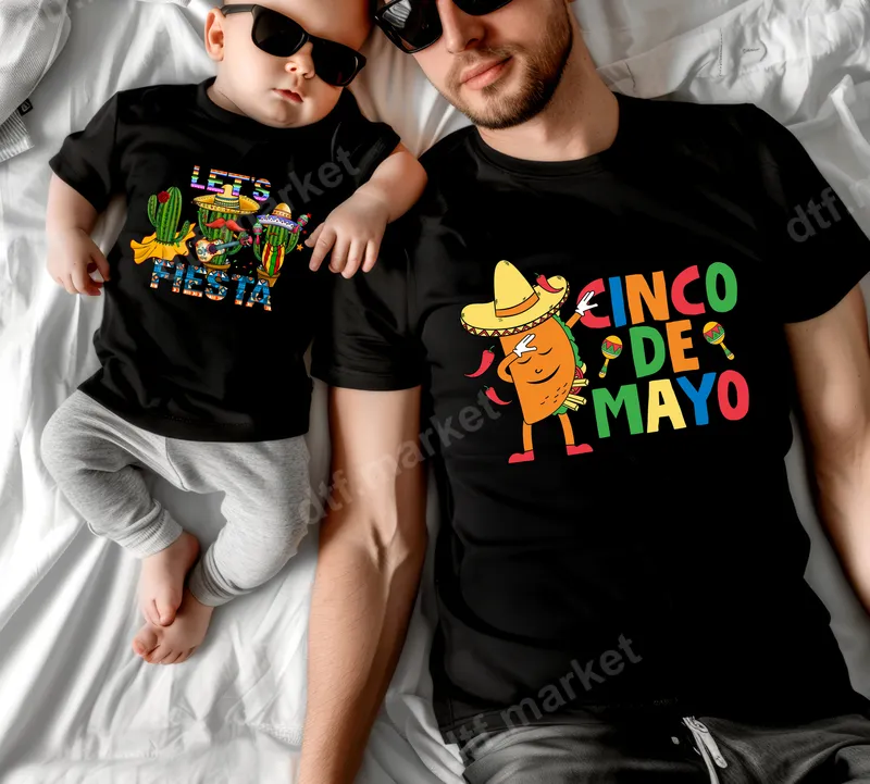 See allThis vibrant DTF transfer set captures the spirit of Cinco de Mayo with two festive designs. One features a hilarious dabbing taco, complete with sombrero, chili peppers, and maracas. The other declares "LET'S FIESTA" alongside a trio of party-ready cacti. These colorful, ready to press designs are perfect for creating unique, celebratory apparel. Ideal for any Cinco de Mayo party, family celebration, or Mexican cultural event, these heat press transfers are fantastic for matching outfits. They make excellent gifts for foodies, taco enthusiasts, or anyone who loves fun, holiday-themed clothing. Create coordinated looks for friends and family, adding vibrant flair to any gathering. Applying your new apparel transfer is simple and mess-free. Our DTF transfers work flawlessly on cotton, polyester, and various blends. For professional results, use a heat press at 300-325°F for 15 seconds with medium pressure. These iron on transfers can also be applied with a household iron, making customization accessible. No weeding or difficult layering, just peel and press! Experience superior quality with our custom transfer designs. Each print boasts incredibly vibrant colors that stand out beautifully on any garment. Our durable DTF film ensures a soft-to-touch finish that is highly crack-resistant and stretches with your fabric, maintaining integrity wash after wash. The strong adhesive provides a long-lasting bond, making your custom shirts or accessories look professionally made for any fiesta.