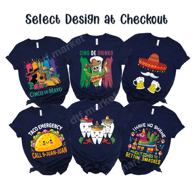 See allDive into the festive spirit of Cinco de Mayo with our vibrant collection of DTF transfers. This exclusive range features six uniquely humorous and celebratory designs, from "Cino de Drinko" skeleton cacti to adorable "Taco Emergency" graphics and playful piñata slogans. Each ready to press transfer brings a burst of color and Mexican cultural flair, perfect for adding a fun touch to any garment or accessory. These humorous heat transfer designs are ideal for anyone looking to make a statement at a Cinco de Mayo party, a casual get-together with friends, or simply to show off their love for tacos and good times. They make fantastic gifts for tequila lovers, fiesta enthusiasts, or anyone who enjoys a good laugh. Perfect for group shirts for celebrations or unique apparel for a night out. Applying your new apparel transfer is effortless. Our premium DTF transfers work beautifully on a wide variety of materials, including cotton, polyester, and blends, offering exceptional versatility. Simply use a heat press at 300-325°F for 15 seconds with medium pressure. For best results, allow it to cool completely before peeling. There's no complex weeding required, making customization quick and simple. Experience professional-grade quality with every iron on decal. Our direct to film transfer technology ensures remarkably vibrant colors, crisp details, and a soft-to-touch finish that resists cracking and fading even after multiple washes. Crafted with strong adhesive, these heat press ready designs provide a durable, long-lasting embellishment that will keep your custom creations looking fresh and fun.