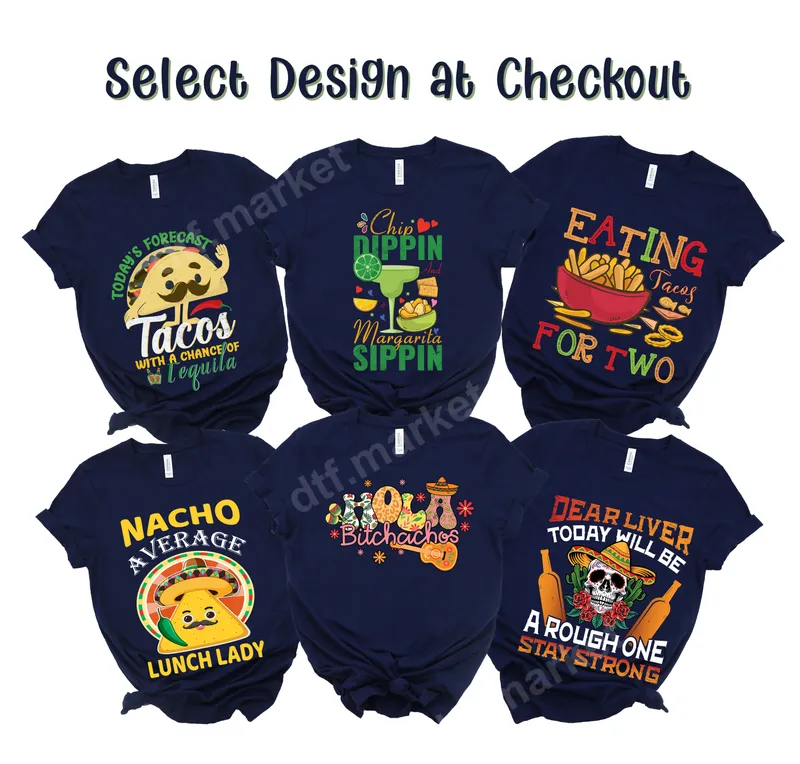 See allSpice up your style with our hilarious collection of Mexican food and drink DTF transfer designs! These ready to press transfers are perfect for Cinco de Mayo, taco Tuesdays, or any fun gathering. Choose from "Tacos With A Chance Of Tequila," "Chip Dippin' And Margarita Sippin'," "Hola Bitchachos," "Dear Liver Today Will Be A Rough One," "Nacho Average Lunch Lady," and "Eating Tacos For Two." Each DTF transfer offers a vibrant, humorous apparel transfer for every personality. These versatile heat transfers are ideal for anyone who loves Mexican cuisine, fun drinks, and a great sense of humor. They make fantastic gifts for friends, family, or treating yourself! Perfect for Cinco de Mayo parties, birthdays, or adding personality to everyday wear. The "Nacho Average Lunch Lady" design is a thoughtful gift, while "Eating Tacos For Two" offers a fun twist for expecting parents or couples. Applying these high-quality iron on transfers is incredibly easy, perfect for crafters and beginners. Our direct to film transfers adhere beautifully to almost any fabric: cotton, polyester, and blends. For best results, use a heat press at 300-325°F for 15 seconds with medium pressure, then peel cold. A household iron works too. Enjoy a heat press ready design with no weeding, cutting, or layering – just press and go! Experience professional-grade results with every custom transfer. Our DTF transfers are known for vibrant colors, sharp details, and exceptional durability. They are crack-resistant, peel-resistant, and feel soft to the touch, ensuring your shirt designs look fantastic wash after wash. Crafted from premium DTF film with strong, flexible adhesive, these apparel transfers provide a long-lasting, high-quality finish that stands out.