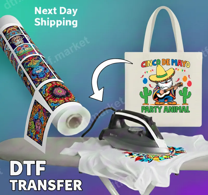 See allCelebrate Cinco de Mayo in style with our festive Party Animal Gnome DTF transfer. This vibrant design features an adorable gnome in a sombrero and poncho, strumming a guitar amidst chili peppers, balloons, and playful cacti. The cheerful 'CINCO DE MAYO PARTY ANIMAL' text clearly states you're ready to fiesta. This high-quality direct to film transfer is ready to press, perfect for custom apparel and accessories. Ideal for anyone looking to add fun to their Cinco de Mayo celebrations, this ready to press transfer suits party-goers, event hosts, or makes a unique gift. Spruce up your wardrobe for parades, backyard barbecues, or themed parties. It's a fantastic choice for friends, family, or small businesses creating seasonal merchandise, offering a quick way to personalize items with a festive iron on design. Applying this heat press transfer is incredibly simple, whether you're using a professional heat press or a household iron. Our versatile DTF transfers adhere beautifully to a wide range of materials, including cotton, polyester, and their blends. For best results, use a heat press at 300-325°F for 15 seconds with medium pressure. Unlike vinyl transfer, there's no tedious weeding, making customization a breeze for t-shirt transfer projects. Experience exceptional quality with our direct to film transfers. Each heat press design boasts incredibly vibrant colors and sharp details that resist cracking and fading, ensuring your customized items look great wash after wash. The finished graphic offers a soft, smooth feel, blending seamlessly with the fabric. Made with professional-grade DTF film and strong adhesive, these apparel transfers provide long-lasting results for all your creative endeavors.
