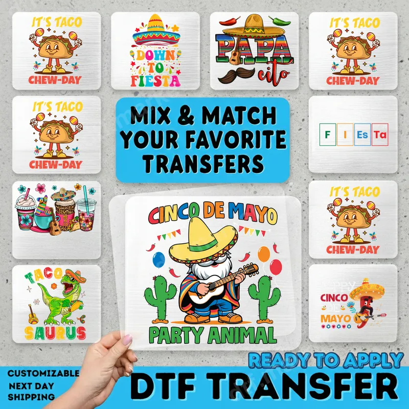 See allCelebrate in style with our festive Cinco de Mayo Party Animal DTF transfer! This vibrant design features a cheerful gnome sporting a classic sombrero and a colorful serape, strumming his guitar amidst playful cacti, balloons, and chili peppers. It's the perfect ready to press transfer to add a touch of fun and festivity to any garment, making your celebration attire truly stand out. This lively design is ideal for anyone looking to embrace the spirit of Cinco de Mayo, whether you're hosting a grand fiesta, attending a themed party, or simply showing off your love for all things Mexican celebration. It makes a fantastic gift for friends, family, or fellow gnome enthusiasts who enjoy a good party. Perfect for event organizers, food truck owners, or anyone who just loves tacos and good times. Applying this direct to film transfer is incredibly easy, making it accessible for both experienced crafters and beginners. Our heat press transfer works beautifully on a wide range of fabrics including cotton, polyester, and blends. Simply use a heat press at 300-325°F for 15 seconds with medium pressure, or apply it with a household iron following our detailed instructions. Best of all, there's no weeding required, saving you time and effort. Crafted with professional-grade DTF film, this iron on transfer boasts exceptional quality. Expect rich, vibrant colors that pop, superior durability that resists cracking and fading, and a soft-to-touch feel that integrates seamlessly with your fabric. The strong adhesive ensures a long-lasting, professional finish, making it an excellent choice for a durable t-shirt transfer or any apparel project.