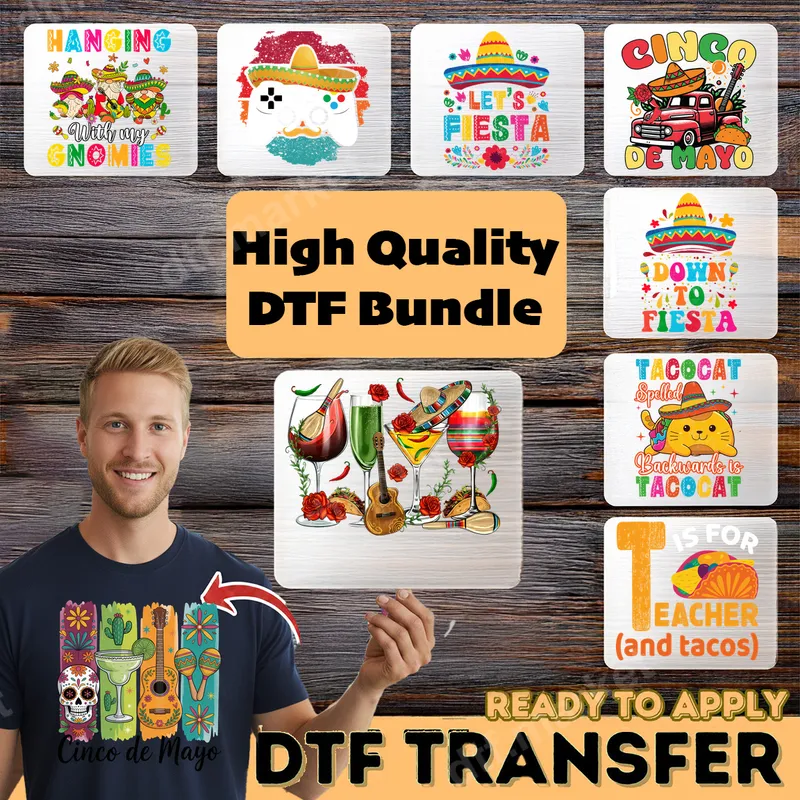 See allThe design features vibrant vertical stripes adorned with iconic Cinco de Mayo elements: a festive sugar skull, a refreshing margarita glass, a classical guitar, and lively maracas. This colorful and celebratory artwork captures the spirit of a vibrant Mexican fiesta, making it a perfect statement piece for any celebration. This high-quality DTF transfer is ready to press, allowing you to easily create stunning custom apparel or accessories. This festive design is ideal for anyone looking to celebrate Cinco de Mayo, attend a fiesta, or simply show their love for Mexican culture and vibrant artistic styles. It’s perfect for party-goers, cultural event enthusiasts, or as a unique gift for friends and family. Craft custom shirts for group events, create unique tote bags, or personalize home decor items for a themed gathering. Our heat press transfer is incredibly versatile, adhering beautifully to a wide range of fabrics including cotton, polyester, and various blends. For best results, apply with a heat press at 300-325°F for 15 seconds with medium pressure, then cold peel. Alternatively, a household iron can be used with firm, even pressure. Enjoy a seamless application process with no weeding, cutting, or layering required, making DIY projects simple and fun. Experience professional-grade results with our durable direct to film transfer. The colors are incredibly vibrant and maintain their intensity even after multiple washes, resisting cracking and fading. Our premium DTF film ensures a soft, flexible feel that seamlessly integrates with your garment, offering a superior look and comfortable wear. Each apparel transfer is crafted with a strong adhesive, guaranteeing long-lasting adhesion and a high-quality finish on all your projects.