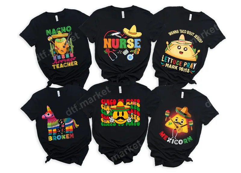 See allGet ready to fiesta with this fun Cinco de Mayo smiley face DTF transfer! Featuring a cheerful mustachioed emoji wearing a festive sombrero and flashing peace signs, surrounded by repeating "Cinco de Mayo" text. This vibrant, ready to press design captures the joyful spirit of the celebration with its bright colors and playful style. It's the perfect direct to film transfer to add a lively touch to any garment or accessory. This lively heat press transfer is ideal for anyone looking to celebrate Cinco de Mayo in style, whether you're attending a parade, a party, or just want to show your festive spirit. It makes a fantastic gift for friends, family, or even yourself to wear to any Mexican-themed event or gathering. Teachers, party planners, or anyone who loves fun, cultural designs will appreciate this cheerful iron on. Create custom apparel for groups or individual celebrations with ease. Our high-quality DTF transfers are incredibly versatile and easy to apply. They work beautifully on a wide range of materials, including 100% cotton, 100% polyester, and cotton/poly blends. Simply apply with a heat press at 300-325°F for 15 seconds with medium pressure, then cold peel. No special equipment is needed, though a household iron can be used for smaller designs. Best of all, there's no weeding or layering required, making your customization process quick and hassle-free. Experience professional results with every application. Our t-shirt transfers boast incredibly vibrant colors that pop, superior stretch, and excellent durability, resisting cracks and fading even after many washes. The soft-touch feel ensures maximum comfort when worn, and the strong adhesive on our premium DTF film guarantees a long-lasting finish. Elevate your apparel with a durable and high-quality heat press design that truly stands out.