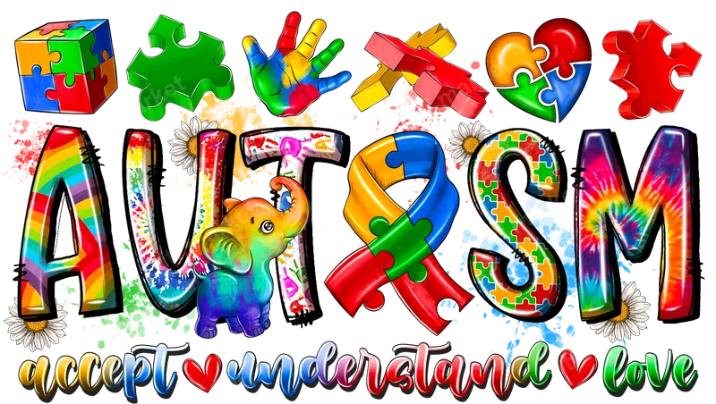 Colorful Autism Awareness DTF Transfer: Accept Understand Love Puzzle Elephant Design