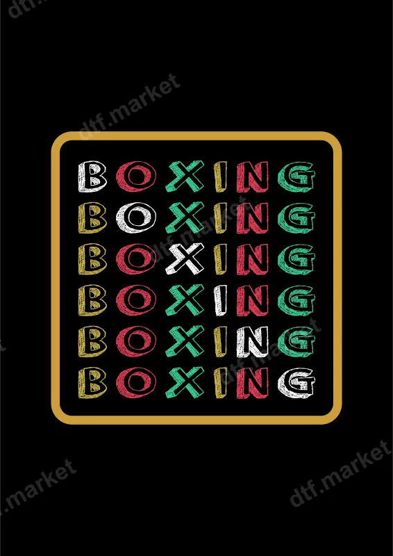See allThis striking DTF transfer features the word "BOXING" repeated six times in a stacked, rounded-rectangle design. Each letter boasts a unique, hand-drawn, sketchy texture and a vibrant mix of white, red, green, and yellow hues, all framed within a bold gold border. This eye-catching direct to film transfer is ready to press, bringing an energetic and retro-inspired vibe to any garment. It's the perfect statement piece for anyone who loves the sport. This vibrant heat transfer is ideal for boxing enthusiasts, gym-goers, athletes, coaches, and sports fans looking to personalize their apparel. It makes a fantastic gift for birthdays, training milestones, or as team spirit wear for boxing clubs and fitness centers. Whether you're a fighter, a trainer, or simply a fan of the sweet science, this design lets you showcase your passion with a bold and colorful graphic. Applying your new heat press design is incredibly simple. Our premium DTF transfers work seamlessly on a wide range of fabrics, including cotton, polyester, and various blends. For best results, use a heat press at 300-325°F for 15 seconds with medium pressure. Alternatively, a household iron can be used for smaller applications. Enjoy a professional finish without the hassle of weeding, making this a truly ready to press transfer. Crafted from high-quality professional DTF film with a strong, durable adhesive, this apparel transfer ensures long-lasting wear. The colors remain vibrant wash after wash, resisting cracking and fading. You’ll love the soft, smooth feel of the design on your garment, which integrates beautifully into the fabric for a premium look and comfortable wear. Elevate your custom t-shirt transfer projects with superior quality and ease.