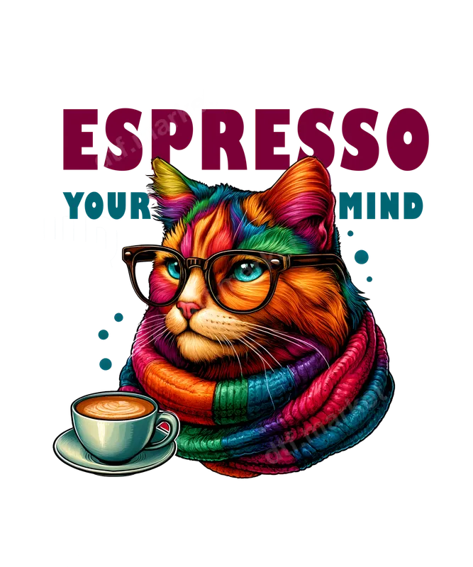 Colorful Hipster Cat Espresso Your Mind DTF Transfer | Ready to Press Coffee Design