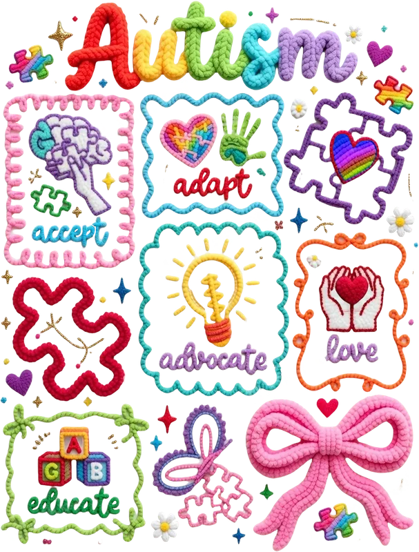 See allThis eye-catching DTF transfer celebrates Autism Awareness with a unique, textured design that resembles colorful knitted yarn. Featuring the word "Autism" prominently, surrounded by inspiring words like "accept," "adapt," "advocate," "love," and "educate," alongside symbolic elements such as rainbow puzzle pieces, a brain, hands, and a lightbulb. This design is vibrant, heartwarming, and ready to press, offering a soft, inviting aesthetic that promotes understanding and support. It's a powerful statement piece designed to bring awareness and compassion to the forefront. This versatile heat transfer is ideal for autism parents, families, teachers, therapists, and anyone who wants to show their support for neurodiversity. It's perfect for Autism Acceptance Month in April, awareness events, school functions, or as a meaningful gift for advocates. Use this inspiring design to create personalized apparel for support groups, charity walks, or everyday wear to spread a message of inclusivity and understanding. It's an excellent way to wear your heart on your sleeve and spark important conversations. Applying this iron on transfer is incredibly simple, making it accessible for both beginners and experienced crafters. Our high-quality heat press design works beautifully on a wide range of fabric types, including cotton, polyester, and various blends, ensuring versatility for your projects. Achieve professional results with a heat press set at 300-325°F for 15 seconds with medium pressure, or easily apply with a household iron. Best of all, there's no weeding required, saving you time and effort for a quick and flawless application every time. Crafted using premium direct to film transfer technology, this design ensures exceptional durability and vivid colors that pop. The advanced DTF film provides a soft, flexible feel that resists cracking and peeling, even after multiple washes, maintaining its integrity and vibrant appearance for years to come. Each t-shirt transfer features a strong adhesive, guaranteeing a secure bond to your garments for a professional finish. Experience superior quality and a lasting message of support with every application.