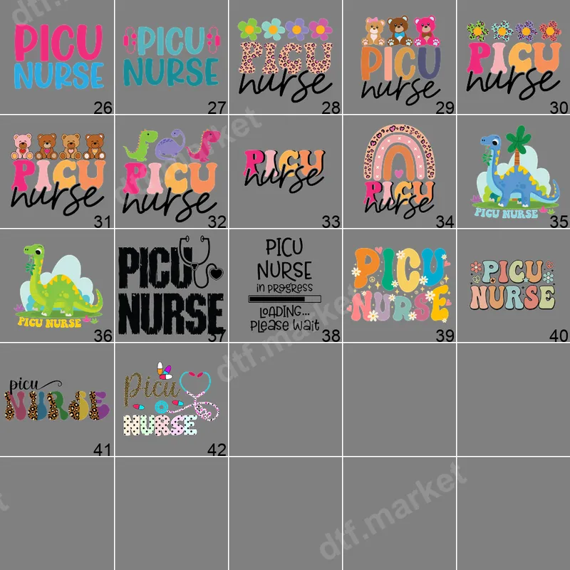 See allShow your pride and dedication with this cheerful PICU Nurse DTF transfer! This eye-catching design features "PICU NURSE" in a playful, multi-colored font adorned with cute flowers and stars, bringing a bright and uplifting vibe. It's a premium direct to film transfer, professionally printed and completely ready to press onto your favorite garments. This ready to press transfer is perfect for any dedicated Pediatric Intensive Care Unit nurse, nursing student, or healthcare professional working with children. It makes an excellent gift for Nurse Appreciation Week, graduation, birthdays, or just to celebrate the everyday heroes in the PICU. Personalize your work attire or casual wear with a splash of color and personality. Applying this heat press design is quick and easy! It works beautifully on cotton, polyester, and cotton/poly blends. For best results, use a heat press at 300-325°F for 15 seconds with medium pressure, then peel cold. A household iron can also be used with firm, even pressure. No weeding or complicated steps required – just press and go. Crafted with professional-grade DTF film and vibrant inks, this iron on transfer ensures a soft feel, exceptional durability, and crack-resistant quality. The colors stay bright wash after wash, making it a long-lasting addition to any wardrobe. Get a professional-looking shirt design right at home with this high-quality apparel transfer.