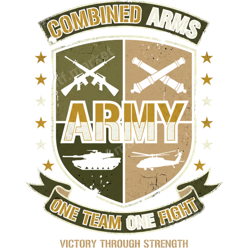 See allThis striking DTF transfer features a distressed shield emblem celebrating the U.S. Army's "Combined Arms" philosophy. The design proudly displays crossed rifles, cannons, a tank, and a helicopter, symbolizing infantry, artillery, armor, and aviation working as "One Team One Fight." Below, the motto "Victory Through Strength" reinforces the Army's enduring spirit. This ready to press transfer is perfect for creating a powerful statement on any garment. Ideal for military personnel, veterans, their families, and patriotic citizens, this apparel transfer makes a meaningful gift for Mother's Day, Father's Day, Veterans Day, or Memorial Day. It's also a great way to show support for active duty service members, commemorate a loved one's service, or personalize gifts for Army graduations and retirements. Our premium direct to film transfers are designed for easy application on a wide range of fabrics including cotton, polyester, and cotton/poly blends. For best results, use a heat press at 300-325°F for 15 seconds with medium pressure, then peel cold. A household iron can also be used. Unlike traditional vinyl transfer, these designs require no weeding and offer a smooth, professional finish. Experience vibrant, full-color printing with exceptional durability. Each heat press design is crafted from professional-grade DTF film, ensuring excellent stretchability, crack resistance, and a soft hand feel. The strong adhesive guarantees your design will withstand countless washes, maintaining its integrity and bold appearance for years.
