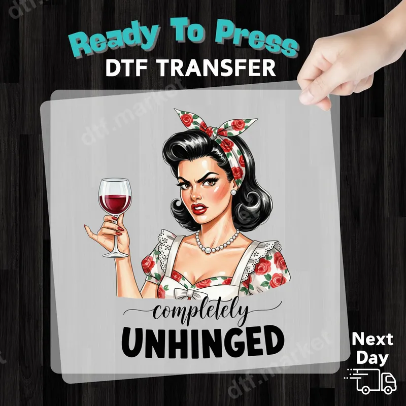 See allThis vibrant DTF transfer features a retro-inspired pin-up girl with a sassy, unamused expression, holding a glass of red wine. Below her, the phrase "completely UNHINGED" is displayed in a chic script and bold text. This ready to press design perfectly captures a humorous, relatable vibe for anyone embracing their wonderfully chaotic moments. The intricate details of her floral headscarf and blouse, combined with her striking red lips, make this a standout piece. Perfect for wine enthusiasts, busy moms, or anyone who appreciates a good laugh and isn't afraid to show their fun, slightly wild side. This heat press transfer makes an excellent gift for birthdays, Mother's Day, girls' night out, or just because you know someone needs a laugh. Create custom apparel for bachelorette parties, wine tasting events, or casual everyday wear to showcase a playful and rebellious spirit. Applying this high-quality shirt design is a breeze. Our iron on transfers work beautifully on a wide range of materials, including cotton, polyester, and various fabric blends. For best results, use a heat press at 300-325°F for 15 seconds with medium pressure. A household iron can also be used with careful application. Enjoy the convenience of a ready to press transfer with absolutely no weeding required, making custom garment creation quick and easy. Crafted using professional-grade DTF film and inks, this apparel transfer ensures exceptional vibrancy and durability. The colors are rich and true to the design, resisting cracking and fading even after multiple washes. Our direct to film transfers provide a soft, smooth feel on the garment, unlike traditional vinyl, offering superior comfort and a long-lasting finish. Elevate your wardrobe with a durable and stylish heat press design.