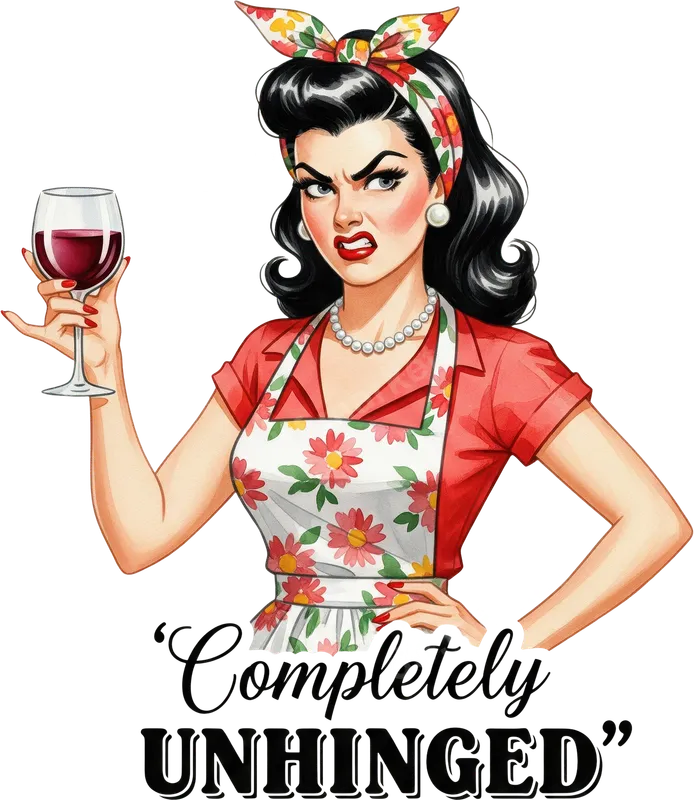See allThis vibrant DTF transfer features a striking retro-style woman, complete with a classic pin-up hairdo, floral headscarf, and apron, holding a glass of red wine with a perfectly exasperated expression. Below her, the bold text declares, "'Completely UNHINGED'." This design perfectly captures that relatable moment of sarcastic humor and playful frustration, making it a fantastic ready to press transfer for anyone feeling a little extra. This funny iron on transfer is ideal for moms, wine enthusiasts, sassy women, or anyone who appreciates a good dose of vintage-inspired humor. It's perfect for casual wear, girls' nights, birthday gifts, Mother's Day, bachelorette parties, or just adding a touch of bold personality to your everyday wardrobe. Make a statement that resonates with a fun, slightly chaotic spirit. Applying your new heat press design is incredibly simple. Our premium direct to film transfers adhere beautifully to a wide range of fabrics, including cotton, polyester, and various blends. For best results, use a heat press at 300-325°F for 15 seconds with medium pressure, followed by a cool peel. This design can also be applied with a household iron, making customization accessible for everyone. No tedious weeding or layering required! Experience superior quality with our professional-grade DTF transfers. Each t-shirt transfer is meticulously printed to ensure vibrant colors, sharp details, and exceptional durability that resists cracking and fading after multiple washes. The soft-touch finish means your apparel will remain comfortable, and the strong adhesive ensures a long-lasting, professional look. Elevate your garments with this unique and expressive design.