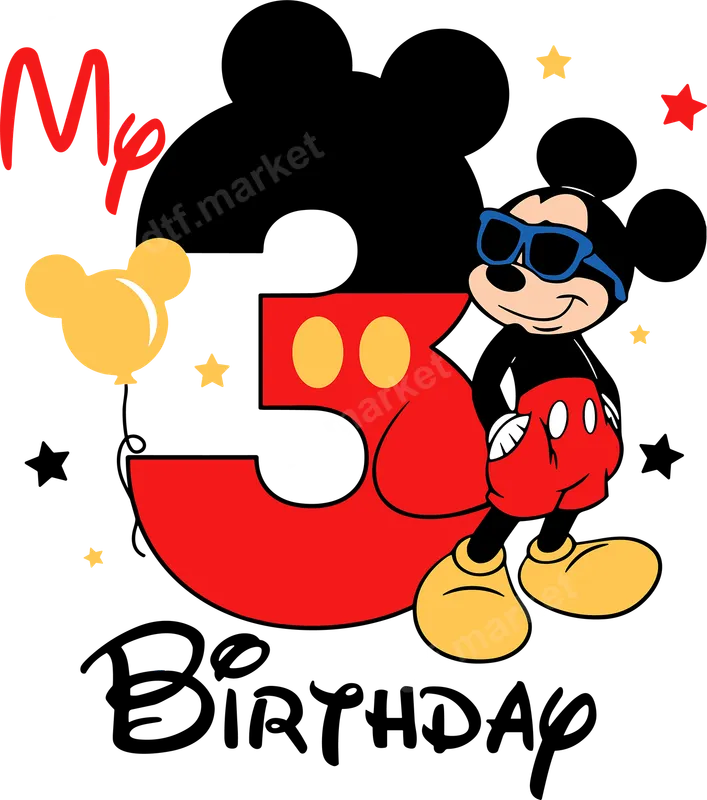 See allThis lively "My 3 Birthday" DTF transfer is perfect for celebrating a special little one's milestone. Featuring a cool, sunglasses-wearing cartoon character in classic red, black, and yellow, this design pops with celebratory energy. A large red '3' is prominent, backed by iconic character ears, surrounded by festive stars and a character-head balloon. This ready to press design brings instant fun to any garment. Ideal for parents, grandparents, or anyone preparing for a toddler's third birthday party, this heat press transfer makes personalized apparel simple. Create unique birthday shirts for the birthday child, matching tops for siblings, or memorable gifts for family members. It's perfect for birthday celebrations, photoshoots, and everyday wear to commemorate this special age. This playful shirt design will surely be a hit! Applying this direct to film transfer is straightforward. Use a heat press at 300-325°F for 15 seconds with medium, even pressure. For home crafters, a household iron can also be used following specific instructions for best results. No tedious weeding or layering required – simply press and peel! This versatile iron on transfer works seamlessly on cotton, polyester, and various fabric blends. Experience professional quality with our premium DTF transfers. Designed for vibrant colors, exceptional durability, and a soft, lightweight feel, this custom transfer resists cracking and fading wash after wash. We use high-grade DTF film and strong adhesive to ensure your design looks fantastic and lasts a long time, making it an excellent alternative to traditional vinyl transfers.