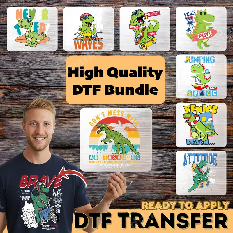 See allThis exciting bundle features 8 high-quality DTF transfer designs, each showcasing a vibrant cartoon dinosaur engaged in awesome activities. From skateboarding and surfing to riding a motorcycle and chilling at the beach, these ready to press designs capture a playful and cool prehistoric vibe. Perfect for adding a unique touch to your apparel, this collection is designed to stand out. This collection is ideal for dinosaur enthusiasts of all ages, from kids who love playful creatures to adults with a fun, retro sense of style. They make fantastic personalized gifts for birthdays, holidays, or just because. Customize t-shirts, hoodies, jackets, and more for family vacations, themed parties, or everyday wear that expresses personality. The "AuTasaurus" design adds a humorous, sassy touch for those with a bit of an edge. Applying these direct to film transfers is incredibly easy and efficient. Our heat press transfers are compatible with a wide range of fabrics, including cotton, polyester, and various blends, ensuring versatility for your projects. Simply use a heat press at 300-325°F for 15 seconds with medium pressure, or apply with a household iron. Best of all, there's no weeding required, saving you valuable time and effort compared to vinyl transfer alternatives. Each t-shirt transfer in this bundle is crafted using professional-grade DTF film, ensuring vibrant colors and exceptional durability. These heat press ready designs are engineered to be crack-resistant, peel-resistant, and incredibly soft to the touch, providing a comfortable, long-lasting finish. Elevate your garments with premium quality apparel transfers that maintain their professional look wash after wash.