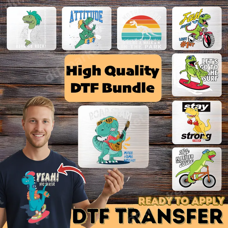See allThis vibrant collection of DTF transfers brings a prehistoric punch to your apparel. Featuring a variety of dynamic cartoon dinosaurs, these ready to press designs include a skateboarding T-Rex with "Attitude," a guitar-shredding rocker exclaiming "Road Roar!", a cool T-Rex catching waves, and a speedy dino on a motorcycle. Each design is packed with personality, perfect for adding a touch of cool humor to any garment. Our Cool Dinosaur DTF Bundle is perfect for anyone looking to add unique style to their wardrobe. Ideal for kids, teens, and adults who love dinosaurs, skateboarding, surfing, or music, these designs make excellent custom t-shirt transfers. They're great for birthday gifts, school events, summer wear, or just expressing a fun-loving attitude. Create personalized shirts, hoodies, or bags that stand out. Applying these high-quality heat transfers is straightforward, ensuring a professional finish every time. Use a heat press at 300-325°F for 15 seconds with medium, even pressure. For best results, peel cold. This direct to film transfer technology means no weeding, no layering, just crisp, vibrant designs applied quickly. They adhere beautifully to cotton, polyester, and most fabric blends. Experience the superior quality of our professional-grade DTF transfers. These heat press designs are crafted for exceptional durability, boasting crack-resistant prints and vivid colors that maintain their intensity wash after wash. The soft-touch feel ensures maximum comfort, and the strong adhesive guarantees a long-lasting bond to your garments. Transform your clothing with a reliable and eye-catching iron on transfer.