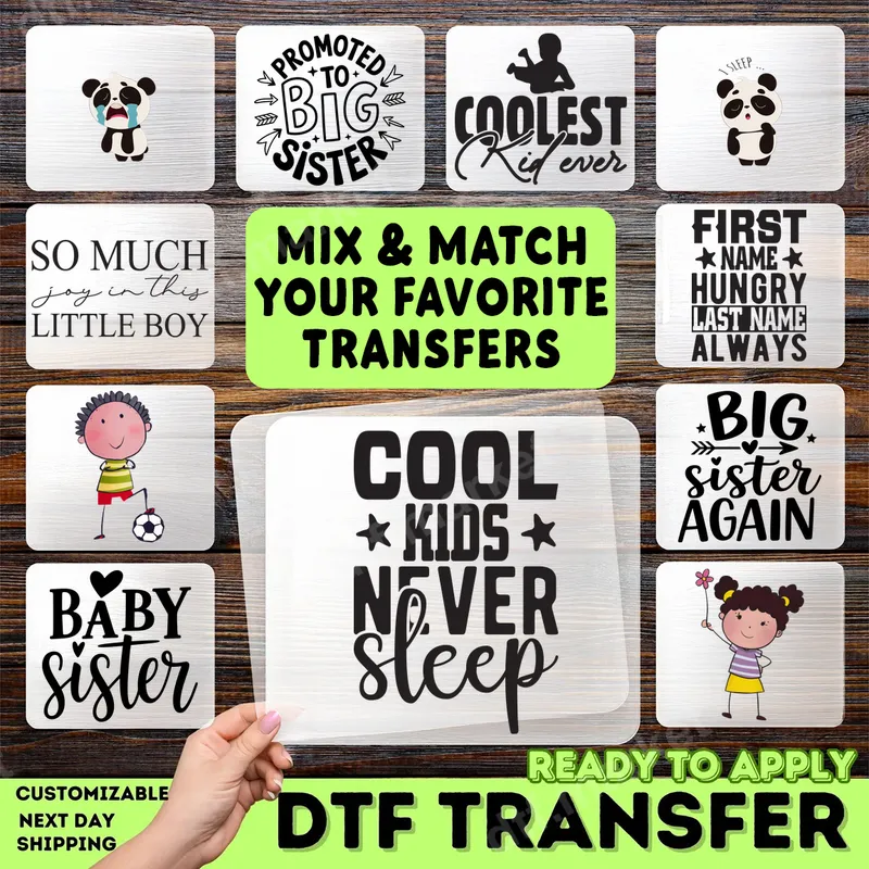 See allThe "Cool Kids Never Sleep" DTF transfer features a playful and energetic phrase in a bold, eye-catching typography mix with star accents. This ready to press design perfectly captures the spirit of active, imaginative children who find excitement in every moment, day or night. It’s an ideal choice for adding a touch of humor and personality to any youth garment or accessory, making it a standout piece. This versatile heat press transfer is perfect for parents, grandparents, or anyone looking to create unique apparel for kids, toddlers, or even playful teens. It’s an excellent choice for birthday gifts, back-to-school outfits, or simply everyday wear that celebrates their boundless energy. Pair it with other designs like "Promoted to Big Sister" or "Coolest Kid Ever" for fun sibling matching sets or memorable family events. Applying this apparel transfer is incredibly easy and hassle-free. Our high-quality iron on decal works seamlessly on cotton, polyester, and various fabric blends. For best results, use a heat press at 300-325°F for 15 seconds with medium pressure. No weeding or layering is required, making it a quick and convenient way to personalize t-shirts, sweatshirts, and other items. You can even use a household iron for smaller projects. Experience professional-grade results with our DTF transfers. Each direct to film transfer is known for its vibrant colors, exceptional durability, and soft-to-touch feel. Crafted from premium DTF film with a strong, flexible adhesive, these designs are crack-resistant and withstand numerous washes, ensuring your personalized garments look fantastic for a long time. This is truly a ready to press transfer you can count on for quality and longevity.