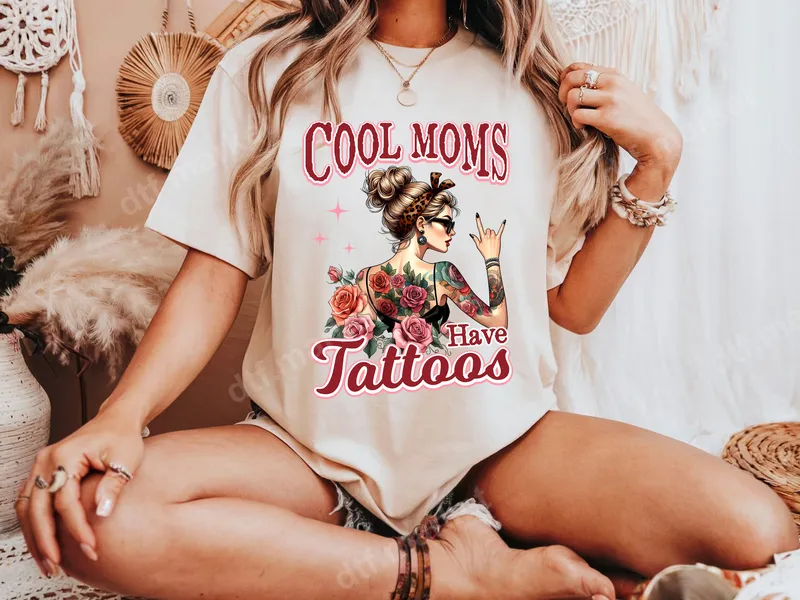See allThis "Cool Moms Have Tattoos" DTF transfer showcases a stylish, tattooed woman rocking a messy bun, sunglasses, and a "rock on" hand gesture, surrounded by blooming roses and sparkling accents. It’s a vibrant, ready to press heat transfer that celebrates strong, modern mothers with a rebellious spirit. Perfect for personalizing apparel and accessories, it lets you express your unique mom pride. This design is ideal for cool moms, tattooed parents, and anyone who embraces an alternative aesthetic while still rocking motherhood. It makes a fantastic gift for Mother's Day, birthdays, or just to celebrate the everyday awesomeness of a tatted mama. Perfect for casual wear, social gatherings, or simply showing off your distinctive style, this heat press design speaks volumes about strength and individuality. Applying this DTF (Direct-to-Film) transfer is incredibly simple. It adheres beautifully to a wide range of materials, including cotton, polyester, and various fabric blends. For best results, use a heat press at 300-325°F for 15 seconds with medium pressure, then cold peel. No complicated weeding is required, making it a quick and easy way to create professional-looking custom apparel. It can also be applied with a household iron for smaller projects. Our premium apparel transfers are produced using high-quality DTF film and vibrant, durable inks that resist cracking and fading, even after multiple washes. The strong adhesive ensures a long-lasting bond, providing a soft-to-touch finish that feels like part of the fabric. You'll love the professional look and feel of these high-quality iron on decals, designed for exceptional color richness and longevity.