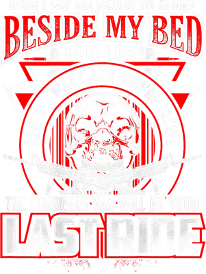 See allUnleash your defiant spirit with this striking 'Coroner's Last Ride' DTF transfer, featuring a menacing skull flanked by crossed assault rifles. The design incorporates bold, distressed typography of the phrase 'Now I lay me down to sleep, beside my bed a gun I keep, and if I wake and you're inside, the Coroner's van will be your last ride,' creating an edgy and powerful statement. This ready to press design is perfect for those who appreciate dark humor, self-defense advocacy, and a no-nonsense attitude. This aggressive iron on transfer is ideal for pro-gun advocates, military veterans, biker enthusiasts, or anyone seeking to express their strong stance on self-preservation. It's a fantastic gift idea for men who appreciate tactical themes, or for small apparel businesses looking to add unique, high-impact heat transfer designs to their collection. Perfect for personal wear, creating merchandise for gun shows or biker rallies, or simply making a bold statement in everyday fashion. Applying this heat press transfer is effortless, suitable for cotton, polyester, cotton-poly blends, and even nylon fabrics. Achieve professional results using a heat press (300-325°F for 15 seconds, medium pressure) or a standard household iron. Say goodbye to tedious weeding – simply peel and press! This design is perfect for custom t-shirts, hoodies, sweatshirts, tactical bags, denim jackets, and vests. For lasting durability, remember to wash your garment inside out and tumble dry on low heat. Experience exceptional quality with this ready to press transfer, showcasing vibrant full-color printing and intricate fine details that truly stand out. It's crack-resistant, soft to the touch, and avoids the heavy, rigid feel often associated with vinyl. Each direct to film transfer is expertly printed on premium DTF film with a robust adhesive backing, ensuring flawless application and professional-grade results on every garment you customize.