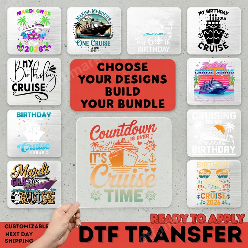 See allGet ready to set sail with our vibrant "Countdown is Over It's Cruise Time" DTF transfer! This exciting design perfectly captures the anticipation and joy of embarking on a sea adventure. Featuring a stylized cruise ship, tropical palm trees, a warm sun, playful anchors, hearts, and ship wheel accents, this ready to press transfer is a visual celebration of vacation. The text is rendered in a mix of bold and script fonts with a cheerful gradient, making it an eye-catching design for any cruise enthusiast. This fantastic design is ideal for anyone looking to celebrate an upcoming cruise, whether it's a family vacation, a birthday cruise, or a fun trip with friends. Create matching t-shirts for your entire cruise squad, design personalized hoodies for a special birthday celebration at sea, or make unique gifts for fellow travelers. It's also perfect for travel agencies promoting cruise packages or for anyone who simply loves the ocean and the excitement of a getaway. Applying this heat press transfer is incredibly easy, making it perfect for both beginners and experienced crafters. Our high-quality DTF transfers work seamlessly on a wide range of materials, including cotton, polyester, and various fabric blends. For best results, simply use a heat press at 300-325°F for 15 seconds with medium pressure, then peel cold. If you don't have a heat press, a household iron can also be used. Best of all, there’s absolutely no weeding or layering required, saving you time and effort! Experience superior quality with our direct to film transfer. Each design boasts incredibly vibrant colors and sharp details that truly pop on any garment. Engineered to be durable and crack-resistant, your custom transfer will withstand countless washes and wear, maintaining its pristine look. The soft-touch feel ensures maximum comfort, unlike bulky vinyl transfer alternatives. Printed on professional-grade DTF film with a strong adhesive, these apparel transfers offer a lasting, high-quality finish for all your projects.