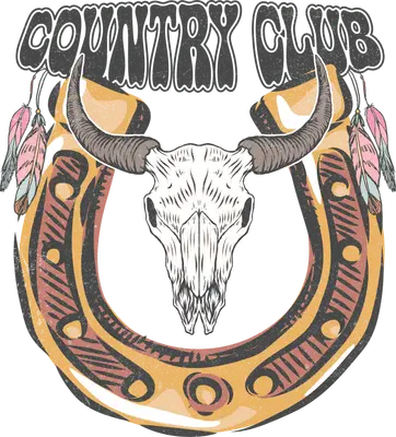 See allEmbrace rustic charm with this unique Country Club bull skull DTF transfer. Featuring a stylized steer skull at its heart, framed by an ornate horseshoe and accented with delicate feathers, this design blends vintage Western aesthetics with a touch of bohemian flair. The distressed texture throughout gives it an authentic, worn-in look, perfect for those who appreciate a rugged yet refined style. This high-quality DTF transfer arrives ready to press, allowing you to effortlessly customize your favorite apparel.