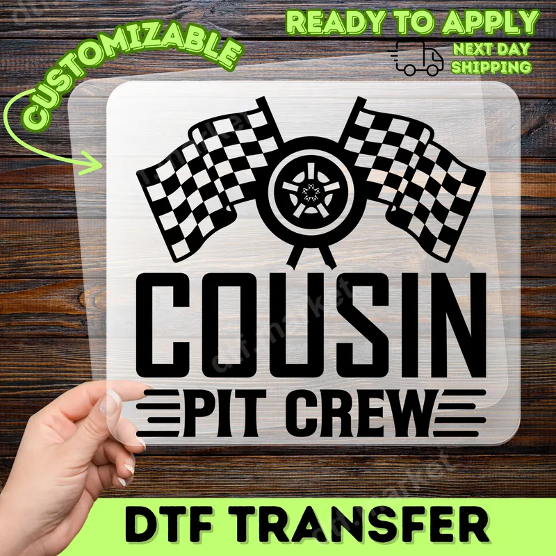 See allThis eye-catching DTF transfer features a dynamic racing design perfect for motorsports enthusiasts. At its heart, two classic checkered flags crisscross behind a stylized car wheel or rim, symbolizing speed and victory. Below this iconic imagery, the bold, clean typography proudly declares "COUSIN PIT CREW," making it clear who's part of the team. This high-quality DTF transfer is produced with vibrant black ink, ensuring a crisp, professional look on any garment, and comes ready to press right out of the package. This design is ideal for any proud cousin supporting their favorite racer, whether it's at a local track or a major event. It’s perfect for family members who are an integral part of the racing team, even if just in spirit. Gift this unique heat transfer for birthdays, holidays, or simply as a thoughtful gesture to celebrate their passion for racing. It's a fantastic way to show team spirit and family pride at track days, car shows, or casual get-togethers. Applying this apparel transfer is straightforward, working beautifully on a wide range of fabrics including cotton, polyester, and their blends. For best results, use a heat press at 300-325°F for 15 seconds with medium pressure. It can also be applied with a household iron, following proper instructions. The best part? No weeding or layering is required, making your custom garment creation quick and hassle-free. Crafted for durability and a premium feel, our direct to film transfers boast exceptional color vibrancy and a soft touch that feels like part of the fabric. They are designed to be crack-resistant and hold up through numerous washes, ensuring your Cousin Pit Crew design stays looking fresh. Each iron on decal is made with professional-grade DTF film and a strong adhesive, providing a long-lasting, high-quality finish for all your custom projects.