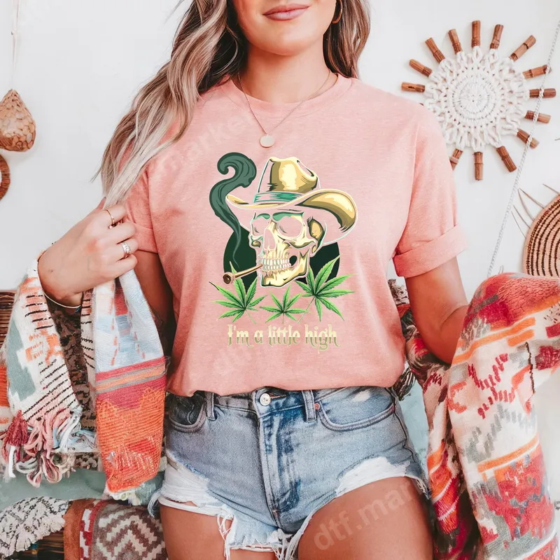 See allDive into a unique blend of western cool and cannabis culture with this "I'm a Little High" DTF transfer. This striking design features a golden-hued skull donning a classic cowboy hat, casually puffing on a pipe that emits swirling green smoke. Flanked by vibrant cannabis leaves, this ready to press transfer brings a bold, humorous statement to any garment, marrying edgy style with a relaxed vibe. This distinctive heat transfer is perfect for cannabis enthusiasts, fans of adult humor, and anyone who appreciates irreverent western flair. Ideal for personalizing your wardrobe for 420 events, casual outings, music festivals, or making a statement. It also makes a fantastic, unexpected gift for birthdays or just because. Show off your laid-back attitude and unique style with this conversation-starting apparel transfer. Applying this premium heat press ready design is incredibly simple. Our direct to film transfer works beautifully on cotton, polyester, and their blends. For best results, use a heat press at 300-325°F for 15 seconds with medium pressure, then cold peel. A household iron can also be used with careful application. Enjoy the convenience of a ready-to-apply iron on decal with no tedious weeding required. Crafted with professional-grade DTF film, this t-shirt transfer promises exceptional quality. The colors are vibrant and true to the design, ensuring your garment stands out. Our transfers are crack-resistant, wash-durable, and boast a soft hand feel that seamlessly integrates with the fabric. Elevate your apparel with a durable, high-quality heat press design that looks fantastic wear after wear.