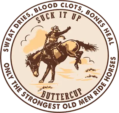 See allUnleash your inner cowboy with this bold "Suck It Up Buttercup" DTF transfer, featuring a vintage-style bucking bronco and rider. Encircling the dynamic image are the no-nonsense phrases, "Sweat Dries, Blood Clots, Bones Heal" and "Only The Strongest Old Men Ride Horses," all rendered in a classic Western font with a distressed, rugged aesthetic. This ready to press design captures the spirit of the rodeo and a resilient attitude in earthy, vintage tones, perfect for making a statement. This iconic iron on transfer is ideal for rodeo enthusiasts, seasoned cowboys, tough dads, and anyone who appreciates a touch of sarcastic humor with a Western flair. Small business owners specializing in custom apparel will find this a popular heat transfer design for their inventory. It makes a fantastic gift for Father's Day, birthdays, Western-themed events, or simply for adding a unique touch to everyday wear for those with a resilient spirit. Applying this heat press transfer is a breeze for professional and home users alike. It adheres flawlessly to cotton, polyester, cotton-poly blends, and even nylon, eliminating the need for tedious weeding. Simply apply with a heat press at 300-325°F for 15 seconds with medium pressure, or use a household iron. Create custom t-shirts, hoodies, sweatshirts, tote bags, pillow covers, baby onesies, aprons, and denim jackets in minutes. For lasting durability, wash inside out and tumble dry low. Our ready to press transfer ensures vibrant, full-color printing with exceptional fine detail, promising a professional finish every time. You'll love the crack-resistant quality and soft-to-the-touch feel, without the heavy vinyl sensation. Each direct to film transfer is printed on premium DTF film, complete with a strong adhesive backing, ensuring brilliant results and long-lasting wear on your chosen garments.